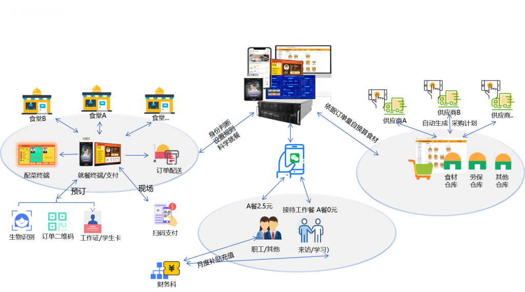 这是一套针对政府、学校、医院等企事业单位食堂的智能化应用,对原来刷卡消费模式食堂的智能化升级,适应现代化需求。